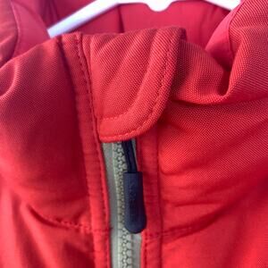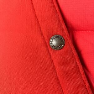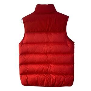 Stylish red puffer vest. Features a high collar and front zipper. Two front pockets with button closure.