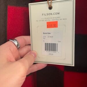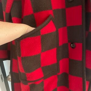 Stylish Filson robe which could be worn as jacket with bold red and brown checkered pattern. Features large pockets and button closure.