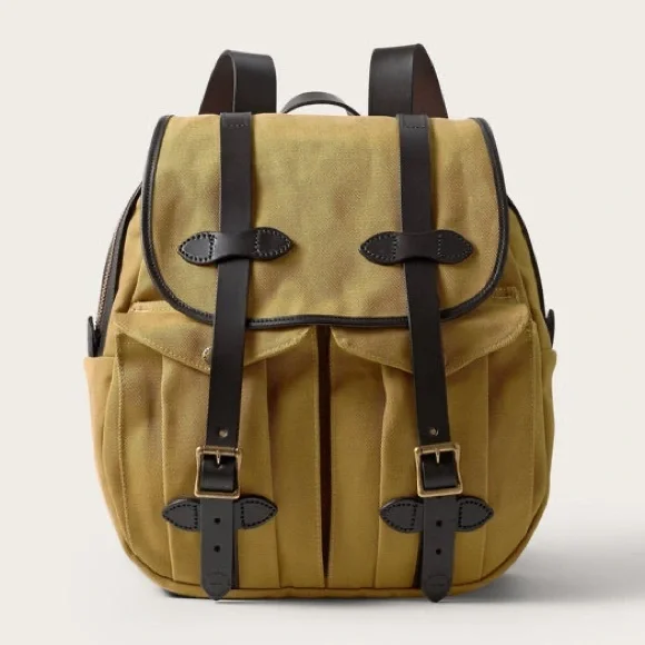 This all-purpose rucksack features saddle-grade Bridle Leather seam binding, reinforcement, body tabs and straps. Three pockets offer storage options, with a roomy interior. The rustproof brass zipper is custom cut at Filson. Double needle construction and bar tacking add durability.