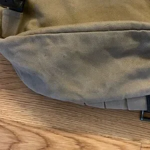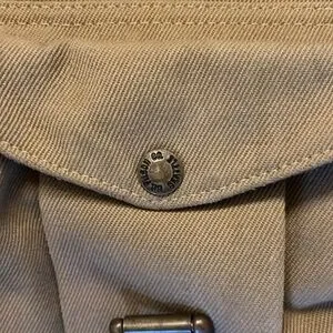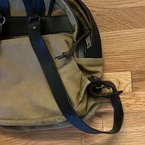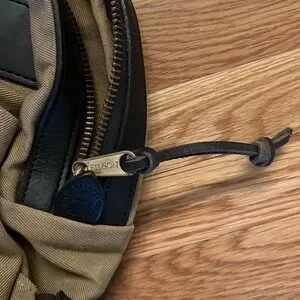 * Solid brass zipper closure custom cut at Filson with storm flap for added security