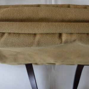 Tan Color. Rugged Twill from British Millerain. Removable Leather Shoulder Strap. Heavy YKK Zipper in Brass. Sand Cast Brass Accents. Two Exterior Pockets and Interior Dividers. Carries up to 15" Laptop. Like New. No Flaws or Stains. Price Listed is Firm.