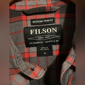 100% cotton Filson Guide Shirt with snap front in western trim fit. Excellent condition with no signs of wear. Chest is 22”, Length is 29 1/4”.