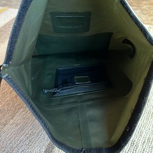 Filson dey bag. Reflective material through the backpack. Exterior pocket and interior pocket. Sternum strap and foam padding in the back. 2 small marks on the front reflective material, see photos.