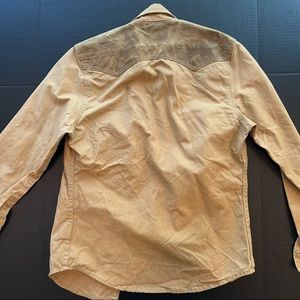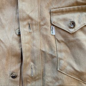 pre-owned Levi's x Filson Mens Long Sleeve (L/S) Western Sawtooth TAN Shirt/Jacket. Excellent Condition. Shirt still feels stiff and has not lost that waxed feel. Shirt color is Tan and has a button up closure. Two front chest pockets. Button up front. See measurements below to ensure fit.