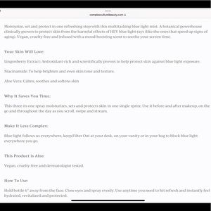 Unopened Filter Out Daily Blue Light Defense Mist by Complex Culture. This is a moisturizing mist with niacinamide which also works as an effective setting spray. Vegan and cruelty free.