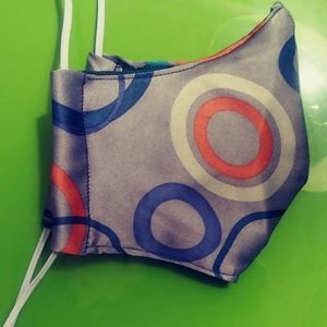 Colorful Polyester mask with cotton lining, filter pouch, one filter included inserted in mask pouch. Washable, reusable, very comfortable to wear. Mask has elastic band that fits around back of head and neck. Easy to put on and off.