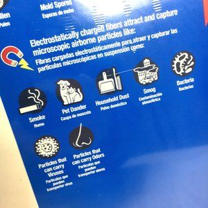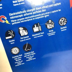 Attracts and captures microscopic particles such as smoke, cough & sneeze debris, bacteria & viruses-- large particles, including lint, pet dander, household dust and pollen