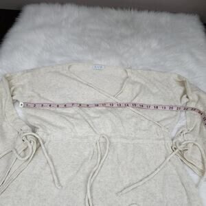 So Gorgeous! Fimfi Large Faux Wrap Drawstring Waist Sweater. 53% acrylic, 45% Cotton, 2% polyamide/nylon. Preowned in great condition. There is no size tag so please see pictures for details and measurements.
