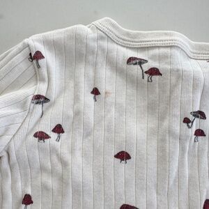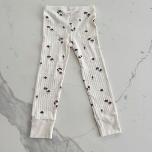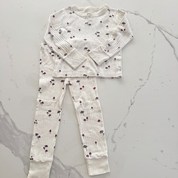 Size 4/5. Shirt is in fair condition with stains as shown. Shows more wash wear than the bottoms which I don't believe we wore more than a couple times. Stains could come out with work, haven't tried hard to get them out. 100% organic cotton for both pieces.