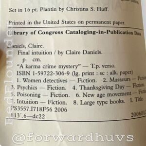 Immerse yourself in the gripping narrative of "Final Intuition," a Karma Crime Mystery by Claire Daniels, featuring large print for an enhanced reading experience. This NAVH (National Association for Visually Handicapped) approved paperback is in good condition, bearing the signs of use and potential bent pages, characteristic of beloved books.