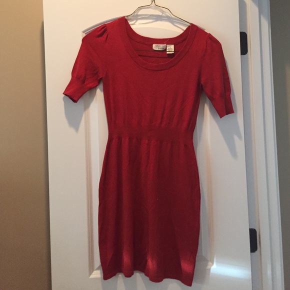 Burnt orange colored dress. Looks great with brown leggings and boots. There are a couple pulls in the material ( see pic). Overall in good shape. Small