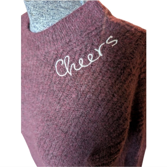 This cozy, super soft burgundy sweater from Target's A New Day line is perfect for the fall and winter seasons. It features "Cheers" embroidered on the collar and has a relaxed fit. This sweater is brand new with tags (NWT) and is a size small. Tags are super cute and ready for gift giving. Perfect for the holidays!