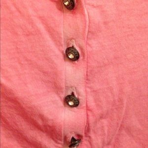 Super soft salmon washed out long tee with 4 rhinestone buttons. This is a four season tee. Perfect for jeans or shorts. Can dress it up or down. You need this in your wardrobe. Most offers accepted Need to empty closet. Price can only be lowered when bundling with other items.