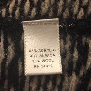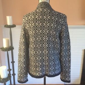 Navy Blue and Ivory Textured Pattern Cardigan. Cuffs, Hemline and 2 Pockets in front trimmed in Navy Blue. 4 Sets of Buttons creating Double Breast Closure in front. Made of Italian yarn consisted of 45% Acrylic, 40% Alpaca and 15% Wool. In Excellent Used Condition, cleaned and stored away.