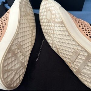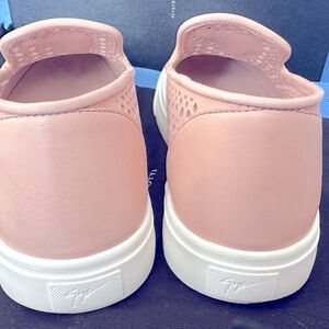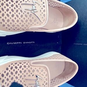 Stylish slip-on sneakers by Giuseppe Zanotti. Features silver metallic accents and tan perforated design. Perfect for casual wear. Size 38 fits 7.5 US. Great quality material, need to add cushion on the back heel for support. Great used condition.