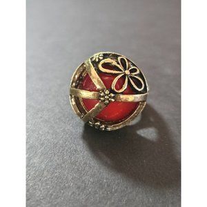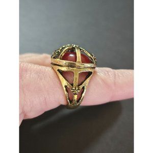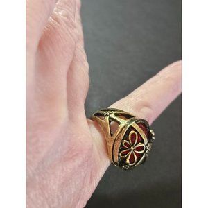 Pretty gold colored ring has a peace sign and flowers. It has a reddish colored faux stone. New!