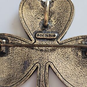 The Vintage Sol D'or Heart Shamrock Brooch Pendant is a stunning piece of Celtic jewelry featuring a red, green, and blue enamel design over a gold base. The intricate details and use of enamel add a unique touch to this vintage piece, making it a standout accessory for any outfit. The shamrock symbol adds a touch of heritage and tradition, while the pin design allows for easy wearing on a lapel, collar, or even as a statement piece on a bag or accessory. Perfect for those who appreciate vintage and antique jewelry with a touch of Celtic flair.