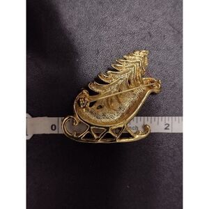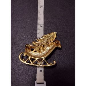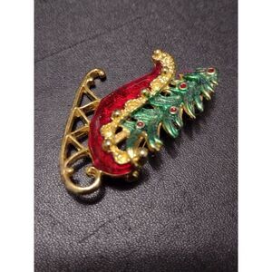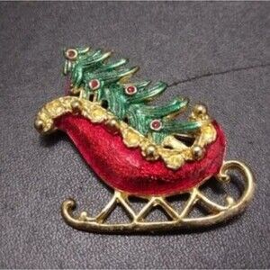 Adorable gold colored holiday brooch is a red enamel sleigh with a green tree.