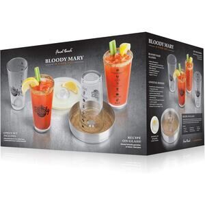 Includes: 4 bloody mary glasses 15 oz (450 ml) each, 1 cocktail rimmer tray & 1 cocktail rimmer lid. | Dimensions: glasses: 3.3" dia. x 5.7" H ( 8.5 cm dia. x 14.5 cm H). rimmer: 6" dia. x 2" H (15.5 cm dia. x 5 cm H) | Capacity: 15 ounce (450 milliliter) | Material: glass, stainless steel & plastic (bpa-free) | Washing: glasses: hand wash only. cocktail rimmer: dishwasher safe (top rack only)