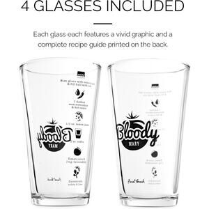 COMPLETE COCKTAIL EXPERIENCE: Set includes 4 thick glass Bloody Mary glasses, each featuring a vivid graphic and a complete recipe guide printed on the back.
