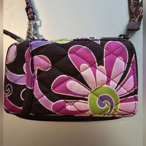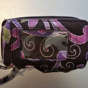 Excellent condition designer fabric lined wristlet, wallet, with multiple compartments, color deep mauve to deep brown