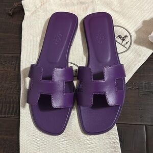 Size 37.5 brand new in box Hermes oran sandals in deep purple. Comes with 2 dust bags and box. Brand new from store.