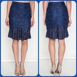 Navy Pencil Skirt with black lace overlay and ruffled hem....perfect for daytime or nighttime. Zipper with hook and eye closure in back....Premium quality from Umgee. Hits right at knee level.