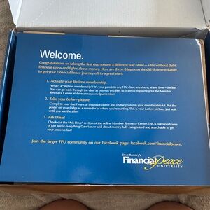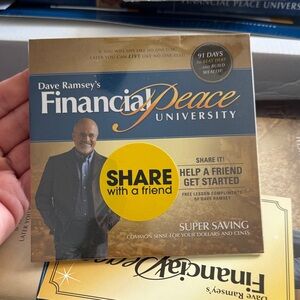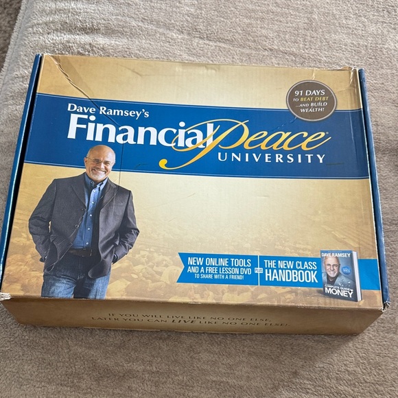 Financial Peace University kit with handbook and DVD. Blue and gold packaging. Handbook in great shape but has been written in some. Comes with two dvd set to share one with a friend.