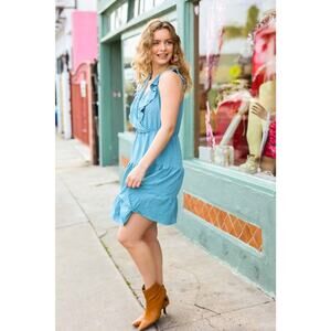 An elastic waist with a beautiful aquamarine color define this woven sleeveless dress. With a surplice ruffle yoke to display your fav accessories, turn heads with this stunning dress. Surplice Design + Tiered + Ruffles Woven - No Stretch 100% POLYESTER Designed in Los Angeles Imported Runs True to Size Weight: .563 lbs Bust (side to side seam) L 21" XL Length (shoulder to hem): L 37" Regular Model Measurements: 5' 7", Size Small, Bust 34", Waist 24", Hips 36"
