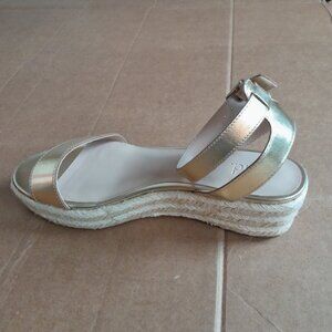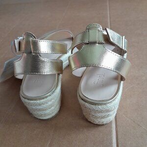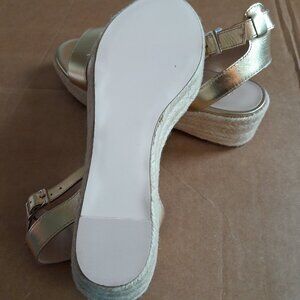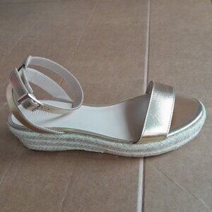 The product is a pair of women's sandals in a medium size 8 with a block heel in a solid gold color. These sandals feature a buckle closure, ankle strap, and adjustable strap for comfort. They are lightweight and suitable for various occasions including travel, wedding, party, casual, formal, and workwear. The outsole is made of rubber, and the upper and lining materials are faux leather. The sandals have a slide style with an open toe design, perfect for all seasons.