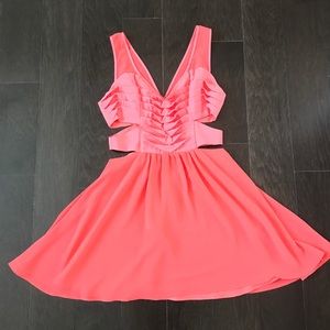Finders Keepers salmon pink cocktail dress. Size 6. Cut outs on the side add to the ruched top. Great for homecoming. Great condition, only a small barely noticeable snag in the chiffon.