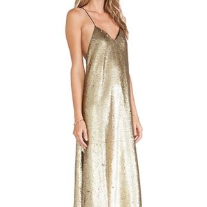 Sparkly glittery Gorgeous gold sequin maxi slit gown from Finders Keepers the Dream On dress size medium. Cross back spaghetti strap. Sexy long slit on each side. Beautiful roomy, flowy dress. Zipper center back. This is in great used condition. Worn/dry cleaned once. This stunning gown is gold, when the sequins flip they are black. Seam line near the bottom hem. Fully lined. Inside minor piling, loose threads. Shoulder to hem approx. 62" modeled photos are from Revolve. Effortlessly chic, glamorous. Style tags Black tie Formal glitter sequins sparkle Wedding Prom Party New Year’s Eve holiday party special event