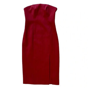 Strapless, structured bodice with boning, midi length, sie lt, back zip.