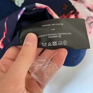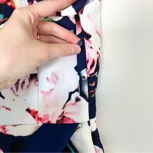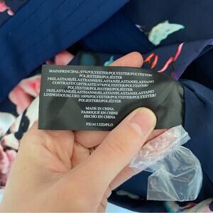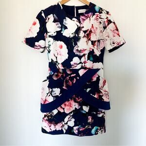 Navy blue with pink floral print, cross over detail, zip on side, keyhole back