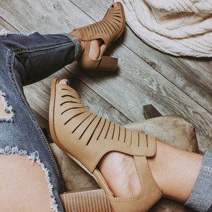 Life is too short for boring shoes. Step up your style with these trendy laser cut booties! Features peep toe, covered back, chunky heel, and side buckle closure