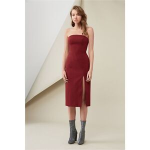 Keep things classy and classic with the Finders Keepers Lucie Wine Red Strapless Midi Dress! Thick, woven fabric forms this structured dress with a strapless, princess seamed bodice (with no-slip strips and hidden boning) that extends into a figure-flaunting midi skirt with side slit. Exposed black zipper and hidden button closure at back.