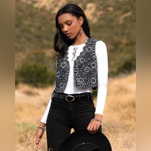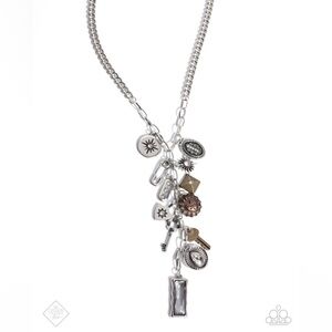 Attached to a classic silver chain, a dainty silver paperclip chain extends below the neckline in a y-shaped display for an eye-catching look. A collection of eclectic charms in silver, brass, and copper finishes featuring various white gems and rhinestones twinkles and extends below the neckline for a free-spirited finish. Features an adjustable clasp closure.