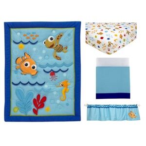 This 10-piece set includes: 1 Comforter (Size: 36 in. x 45 in. | Polyester Cotton Blend) 1 Fitted Sheet (Size: 28 in. x 52 in. | 100% Cotton) 1 Dust Ruffle (Size: 28 in. x 52 in. w/ 12 in. drop | 65% Polyester, 35% Cotton) 1 Window Valance (Size: 60 in. x 13 in.) 1 Blanket (Size: 30 in. x 40 in. | 100%Polyester) 1 Nemo-shaped Mat 1 Plush Nemo Doll (Size: 14 in. ) 1 4-piece Removable Wall Stickers (Each sheet measures 17.5" x 10") 1 Nemo Wall Art 1 Protector (Fits Standard Crib)