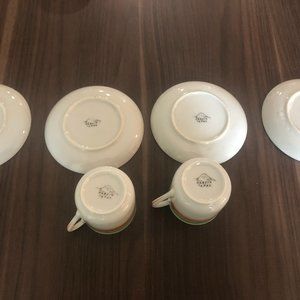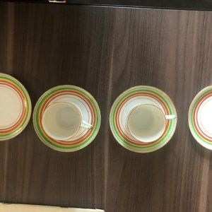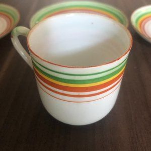 The pattern is green, yellow and orange stripes. For some reason I have 2 teacups and 4 saucers. They would be perfect for espresso or a tea party.