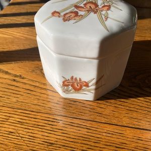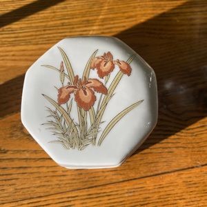 Beautiful, metallic irises adorn this porcelain octagon-shaped trinket box. So many uses. No chips or flaws.