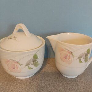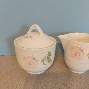 Fine China of Japan Sculpture Rose pattern sugar and cream set. Beautiful 1980s set featuring a pink rose design. In excellent vintage condition