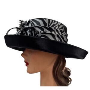This stunning Fine Millinery Collection by August Accessories “Velma Cloche” hat features a bold black-and-zebra print crown, structured wide brim, and dramatic feather floral trim at the side. A modern take on classic cloche elegance, it’s perfect for dressy events, horse races, church, or statement vintage styling.