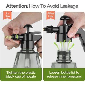 |Tips to Avoid Water Leakage| Remember to tighten the black plastic part of the nozzle before spraying. Besides, loosen the lid after each use to release the inner pressure.