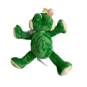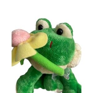 Fine Toy Green Frog Plush Stuffed Animal Holding Pink Yellow Flower Sheer Bow. Frog is holding flower in mouth, super cute!