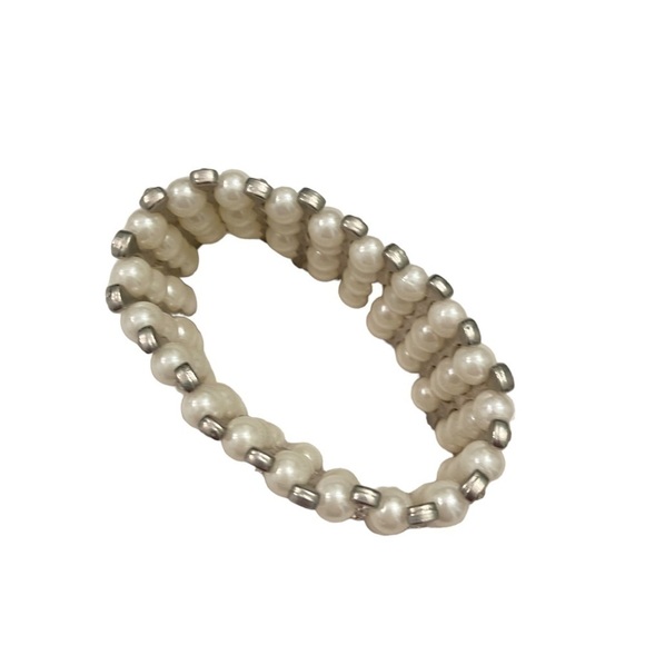 This bracelet does not have a brand name but is clearly fine costume jewelry! A stretch bracelet featuring 4 rows of white faux pearls separated by silver tone & clear crystals. In like new condition.