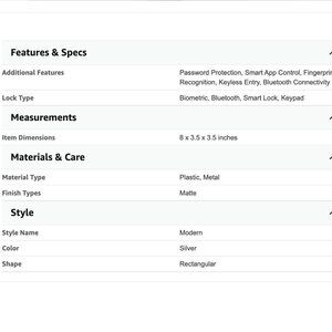 Features: Password Protection, Smart App Control, Fingerprint Recognition, Keyless Entry, Bluetooth ConnectivityPassword Protection, Smart App Control, Fingerprint Recognition, Keyless Entry, Bluetooth Connectivity