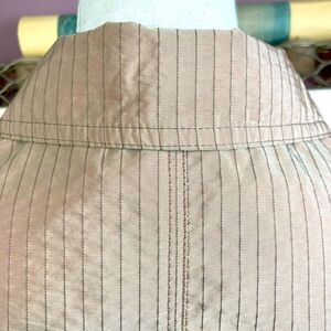 This stylish pink blazer subtle shimmer blazer w/gray woven thread offers a unique sophisticated look for any occasion. Lining is gray. Burnished pewter buttons down front and on each sleeve. Nice collar . Zipped pockets. This boutique and brand dresses Charleston SC and Nashville’s Biggest stars and most stylish clients. Pit to pit closed 19” shoulder to hem 22”. Very lightly padded shoulders inside lining to keep form. Sleeve: shoulder to hem 19” pit to hem 12”. EUC no flaws. Beautifully made. Coastal Cowgirl, menswear, western, steampunk.