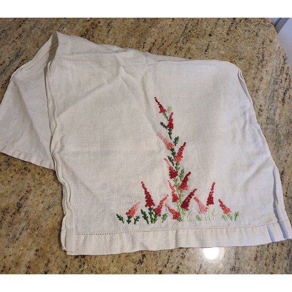 Finished Needlework Red Pink Lupines Embroidered Linen Tea Towel