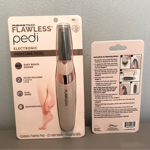 Finishing Touch Flawless Pedi Electronic Pedicure Tool.Easy reach design. One coarse & one fine heads included. Also includes a refill package of one fine roller head & two course roller heads. It is also dual speed & rechargeable. New in package.