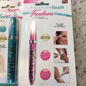 The Finishing touch Freedom Personal hair Remover Removes hair instantly and Pain Free. It comes with Built in Light, It Pivots and is Dermatologist approved. Also comes with a comb attachment. Available in two different patterns